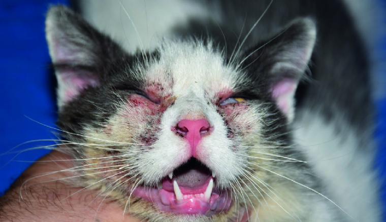 Mercredi 18 Décembre 2019 Animaux de compagnieChat européen atteint de prurit cervico-facial : noter l'érythème, les érosions et les croûtes.