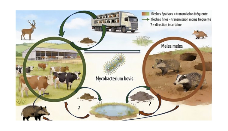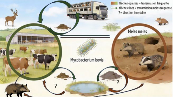 La bactérie s'inscrit dans ce qu'on appelle un système multi-hôtes qui rend son éradication difficile, en raison des réservoirs sauvages (cervidés, sangliers, blaireaux) et domestiques (bovins, canins, porcins) qui se contaminent mutuellement et contaminent leur environnement (Figure 1).