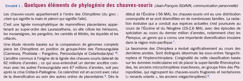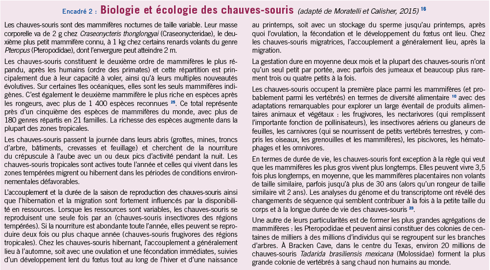 Les chauves-souris sont présentes sur l'ensemble de la planète, à l'exception de l'Antarctique, et occupent des niches écologiques diversifiées. Plus de 1400 espèces de Chiroptères ont été identifiées, soit 20 % de toutes les espèces de mammifères 25. Ce remarquable succès évolutif (cf. encadré 1) peut être attribué aux multiples adaptations que présente ce groupe de mammifères : vol actif, écholocation laryngale, apprentissages vocaux, grande longévité et présence d'un système immunitaire particulier qui leur permet d'héberger des virus qui sont létaux chez les autres mammifères 14. Le remarquable site de Simmons & Cirranello : https://batnames.org/home.htmldonne plus de détails sur les différentes espèces de chauves-souris. Par ailleurs, certaines chauves-souris s'adaptent bien aux habitats perturbés (Jones et al. 2009 12), de sorte que, dans un contexte d'augmentation des épidémies en lien avec la dégradation de plus de 75 % des milieux terrestres, en particulier ceux qui présentent une grande richesse biologique 8,11, ces vertébrés sont devenus récemment un centre d'intérêt des études épidémiologiques.