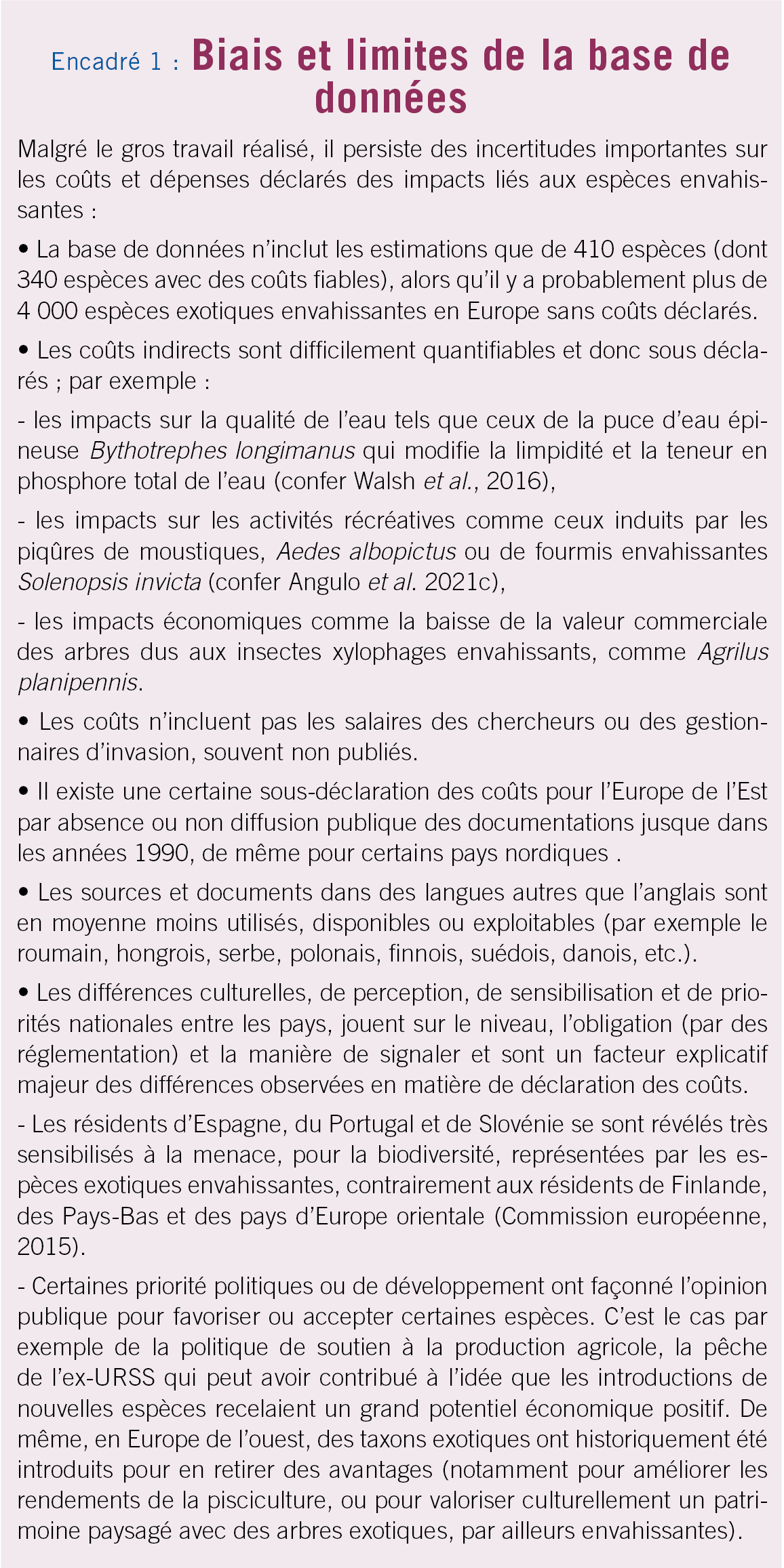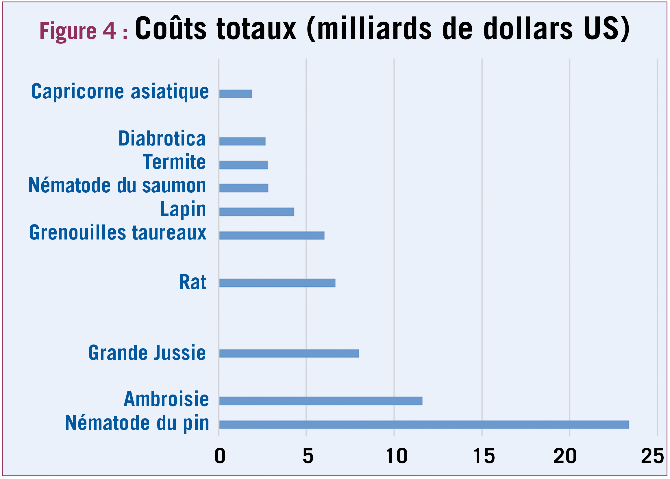 Les impacts écologiques des espèces exotiques envahissantes sont de mieux en mieux connus mais il restait à évaluer leurs potentiels impacts économiques qui, sauf pour quelques espèces ou habitats, restaient largement inconnus, en partie en raison de l'absence de données fiables ou disponibles. C'est le travail qui a été mené par l'initiative InvaCost (Diagne et al. 2020a, 2020b) qui a constitué une base de données avec plus de 7 000 entrées de coûts économiques déclarés d'espèces exotiques envahissantes, extraits de littérature grise et académiques (coûts standardisés dollars US, 2017, avec 1 USD = 0,8852 €).