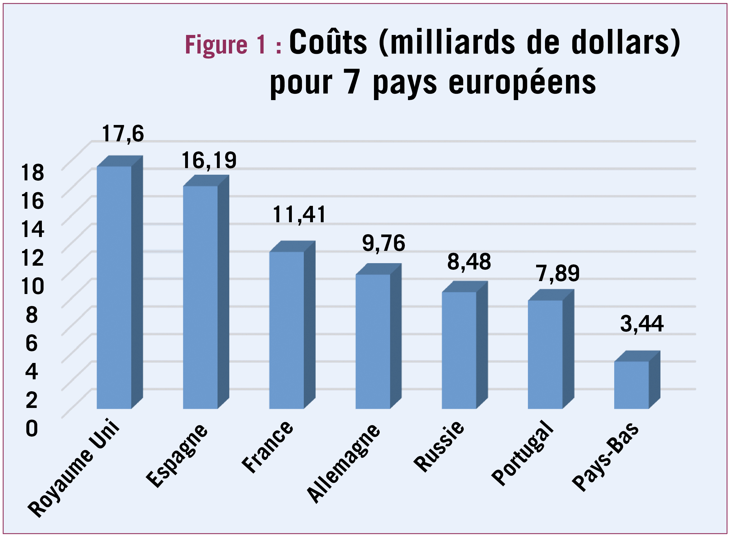 Des différences marquées ont été observées dans la déclaration des coûts entre les pays européens, avec des impacts plus importants déclarés sur les économies britannique, espagnole, française, allemande, russe, portugaise, hollandaise. Les coûts observés signalés pour les autres pays étant inférieurs à 1 milliard de dollars US par pays.