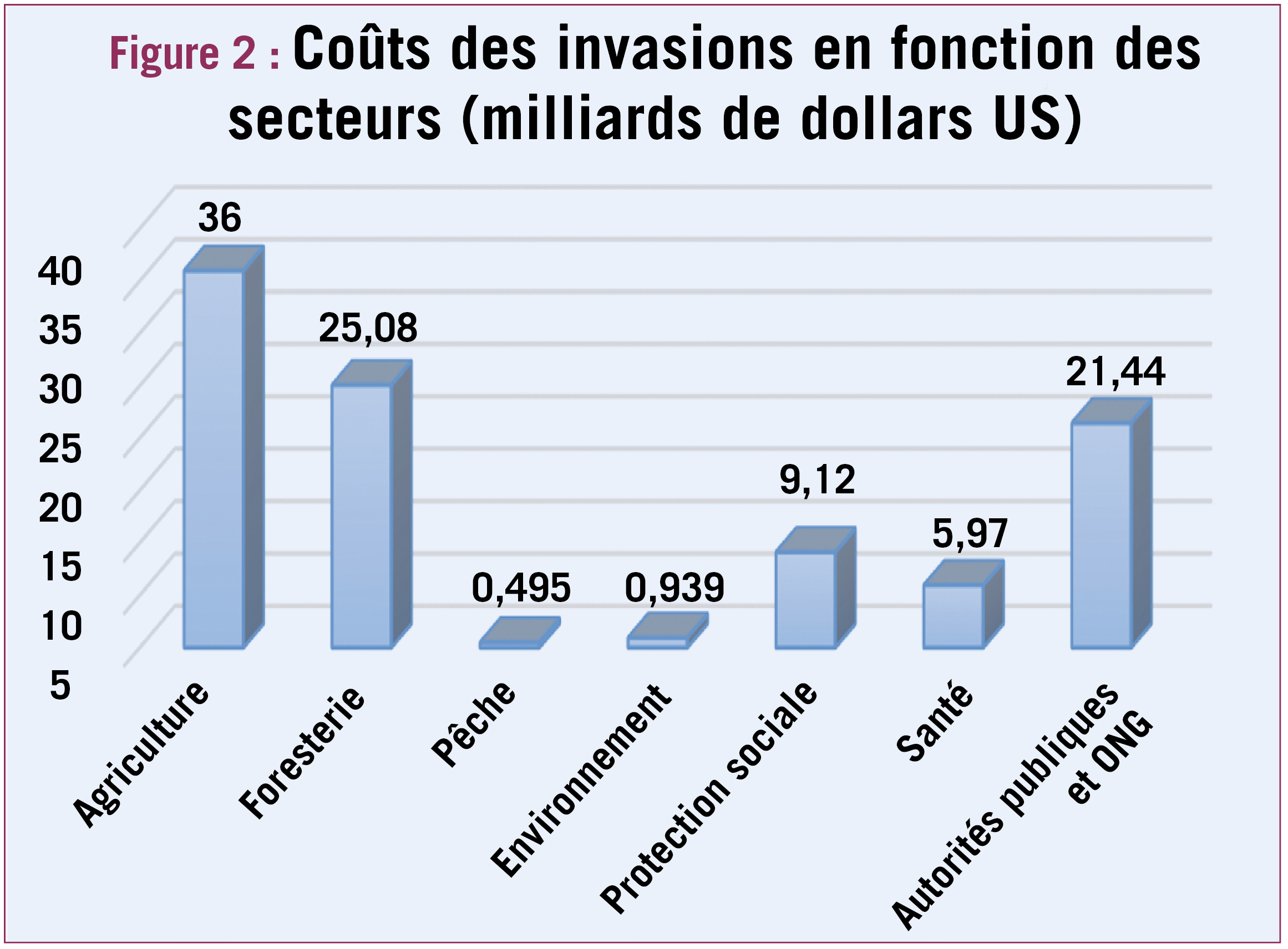 Les secteurs les plus touchés sont les secteurs agricoles, la foresterie et les interventions des autorités publiques et des ONG (qui gèrent les invasions lorsqu'elles se produisent). Les secteurs non représentés dans la figure 2 ont des coûts de moins de 1 milliard de dollars US. Il persiste des incertitudes sur l'affectation aux différents secteurs, une part substantielle des coûts déclarés (29 % ; 41,17 milliards de dollars) n'ayant pas pu être attribuée à un seul secteur.