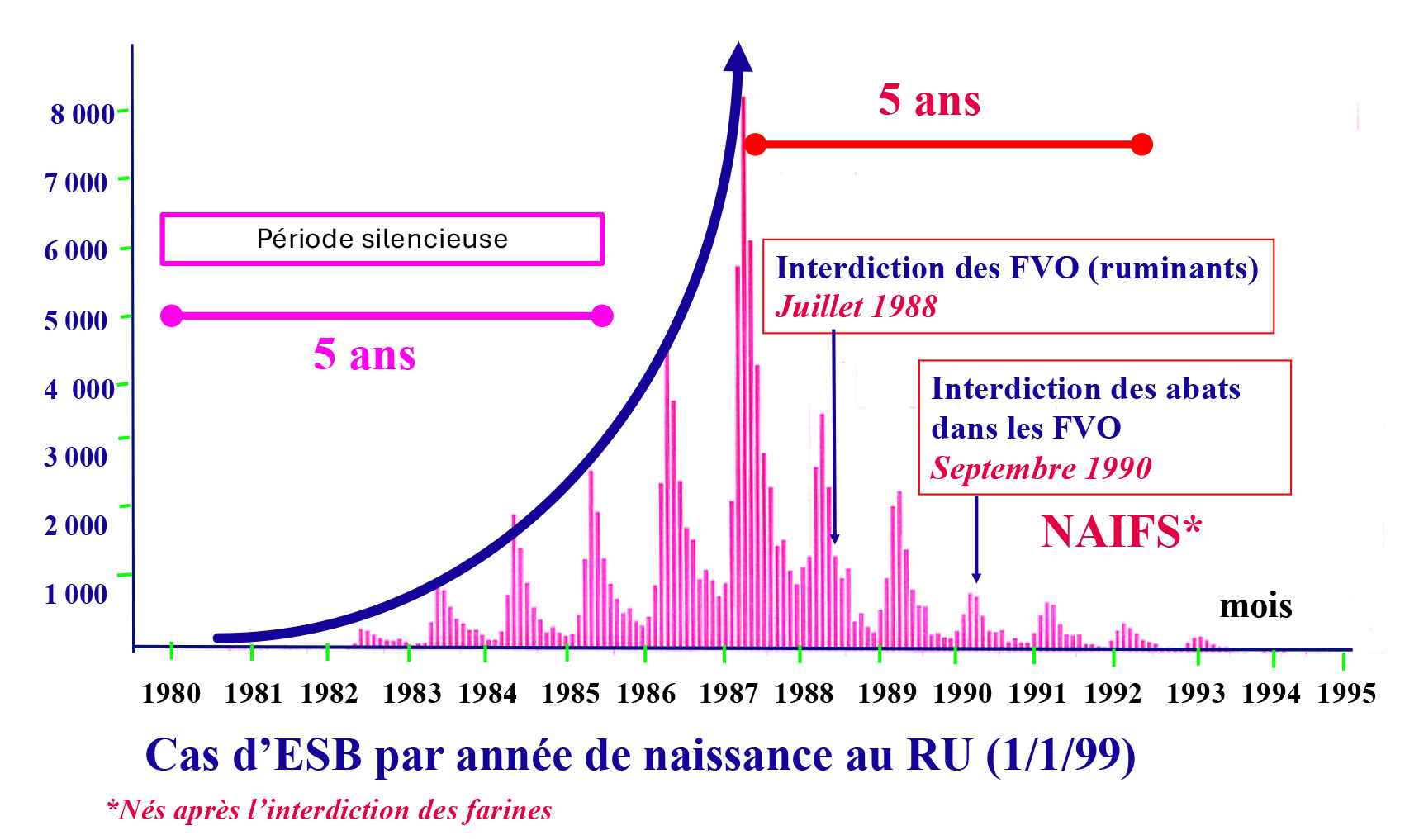 Ayant appris en 2000 par les douanes britanniques que nous avions importé 20 fois plus d'abats anglais vers la France à partir de 1988 (soit environ 6 000 tonnes par an pendant les deux périodes où les mesures de précaution britanniques pour ces abats n'étaient pas encore appliquées), on pouvait ainsi prédire qu'il y aurait plus de cas à partir de 2004-2005 en France et que cela durerait 2 ans. Ce fut le cas et l'on peut noter le délai de 5 ans entre les mesures de précaution prises au RU et hors RU, la France étant le pays le plus touché après le RU avec 29 cas sur les 55 notifiés hors RU (figure n° 3).