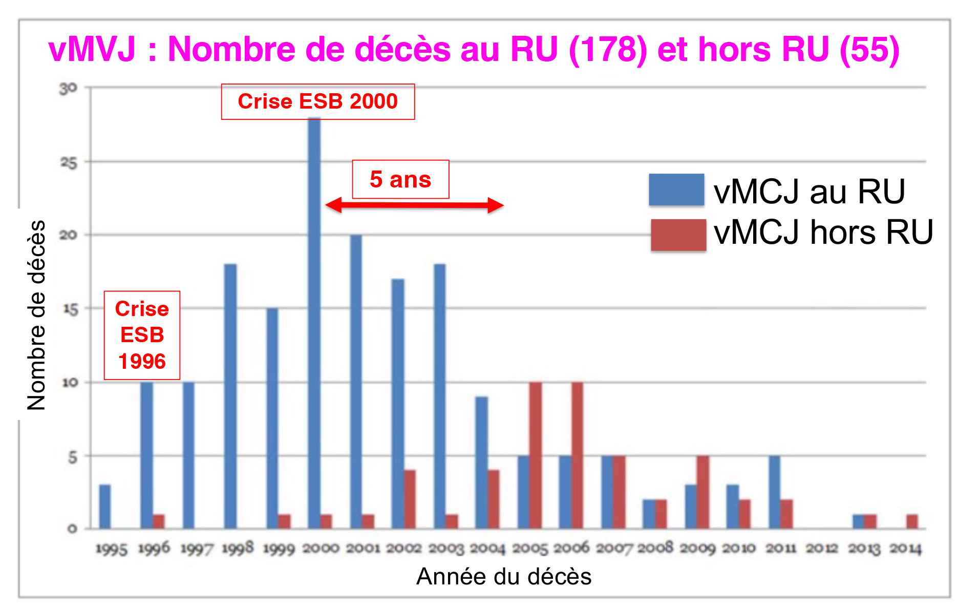 L'augmentation régulière des cas de vMVJ au RU vers un pic inquiétant de 28 cas en 2000 a amené certains épidémiologistes scientifiquement reconnus à annoncer une troisième crise plus grave liée à l'ESB (figure n° 2). Mais en 2001, une étude française s'est révélée plus rassurante en prédisant un total de 205 cas de vMCJ, avec une durée moyenne d'incubation de 16,7 ans.