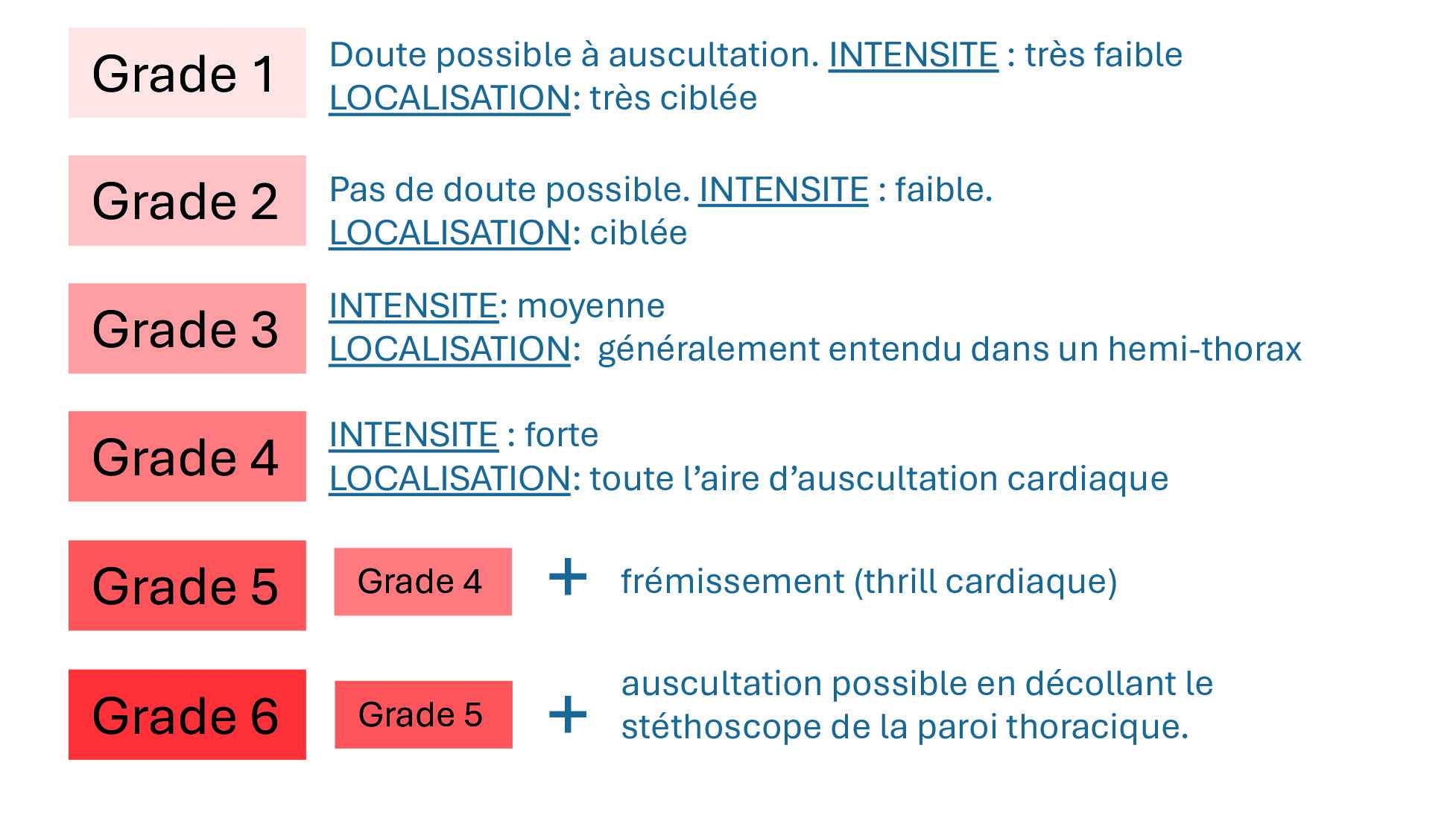 Les souffles cardiaques en médecine vétérinaires sont toujours gradés de 1 à 6 en fonction de l'intensité et de l'étendue de la zone dans laquelle le souffle est entendu.