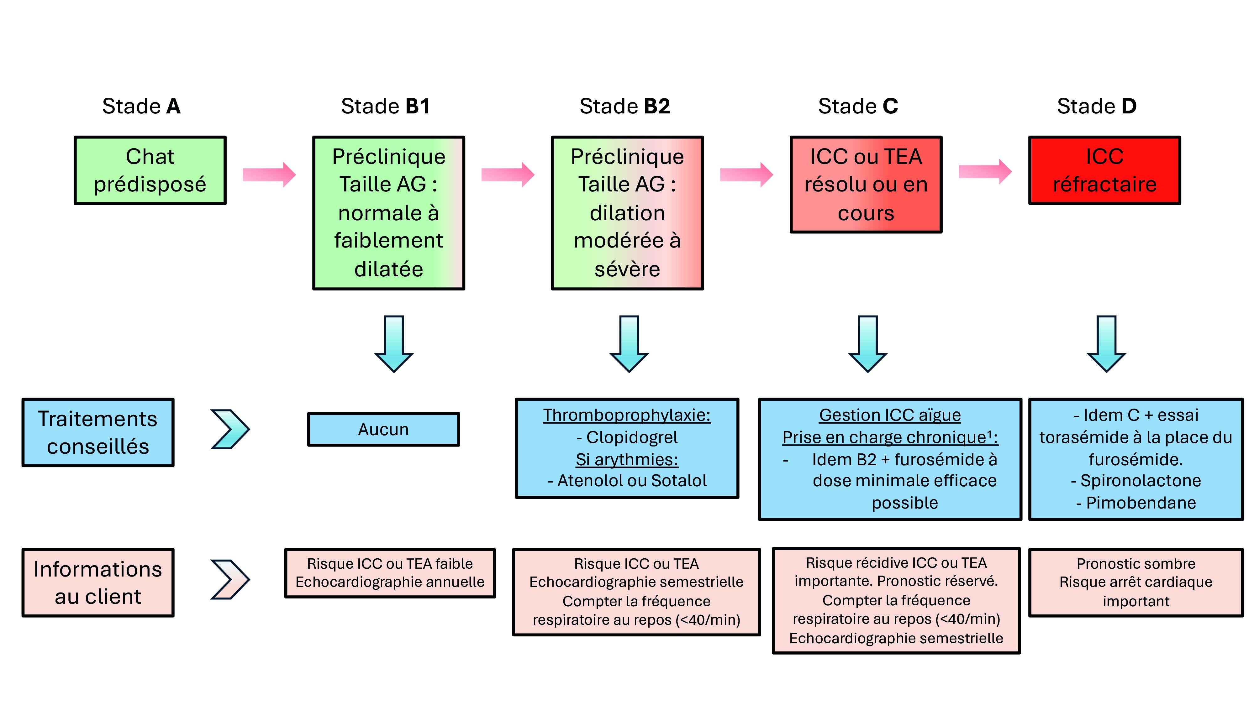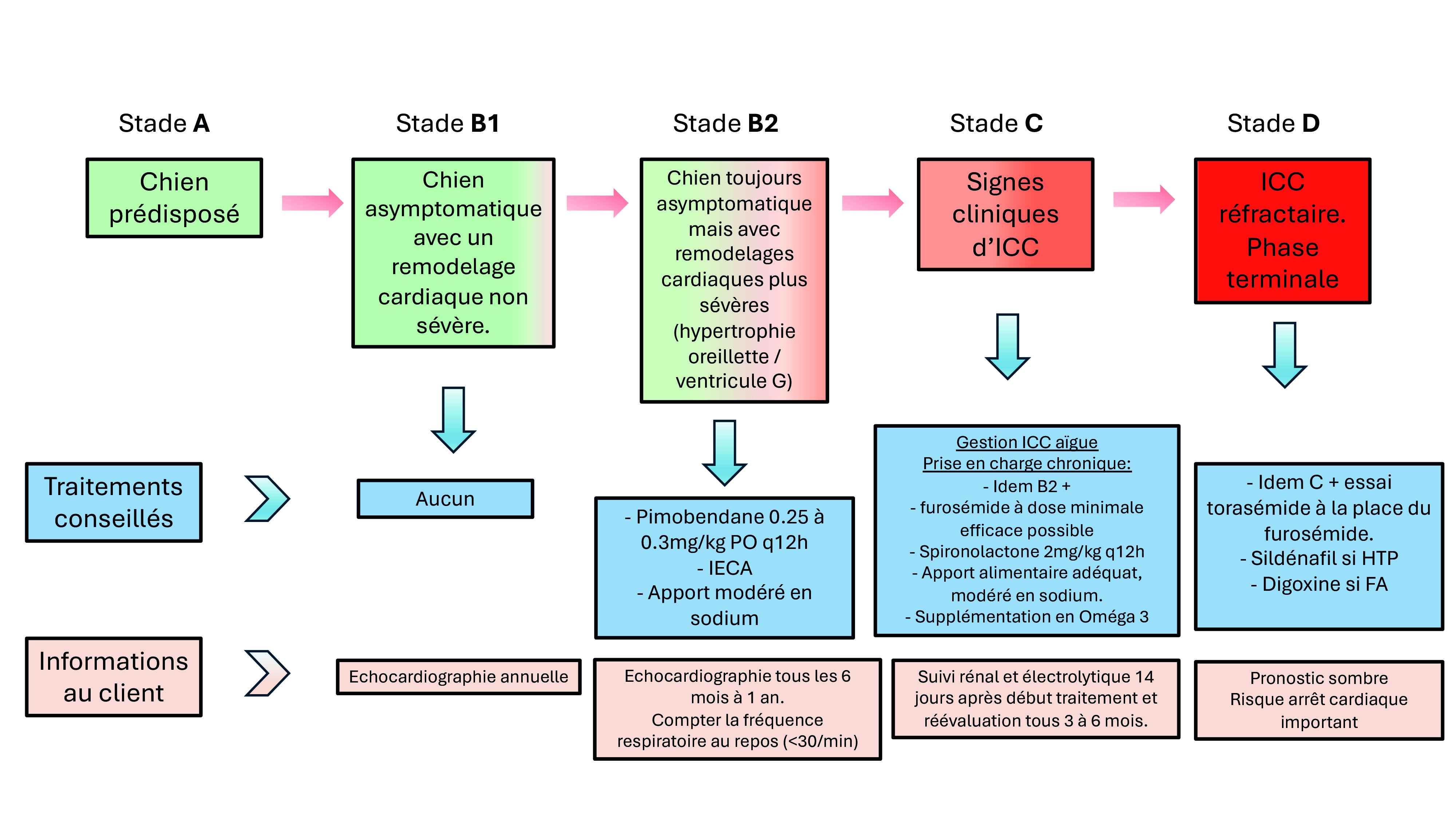 Les maladies cardiaques sont nombreuses chez nos animaux de compagnie tout comme les consensus de prise en charge ou les traitements disponibles. L'objectif de cet article est donc de résumer les différents stades cliniques et/ou échographiques ainsi que les traitements envisageables afin de les comprendre et de s'y retrouver facilement à la lecture d'un compte rendu d'un(e) confrère et de pouvoir tenir un discours clair et limpide au propriétaire.
