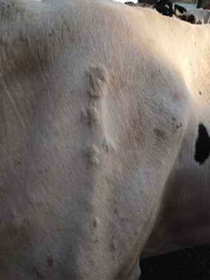 Ce fut le cas d'une suspicion de DNC déclarée début septembre dernier, dans un élevage de 700 vaches laitières à plus de 450 km du foyer lyonnais dans la région de Verdun avec les commémoratifs suivants : une hyperthermie transitoire (39 à 40° C) suivie de l'apparition de plusieurs nodules cutanés répartis sur tout le corps, en l'absence de tout autre symptôme pouvant évoquer la DNC - pas d'hypertrophie ganglionnaire, appétit conservé ; pas de diminution de la production laitière, pas de mortalité.