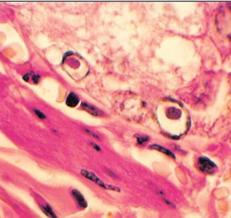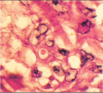 A l'examen histologique, la présence de corps d'inclusion intranucléaires est caractéristique de l'herpèsvirose, contrairement au capripoxvirus de la DNC associé à des inclusions intracytoplasmiques (figures n° 6a et 6b). J.B.-P.