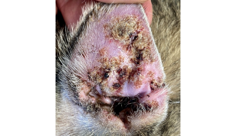 Mercredi 22 Octobre 2025 Animaux de compagniePhoto n° 1A : Noter le tissu prolifératif, friable et croûteux et la peau érythémateuse de la face interne des pavillons auriculaires.