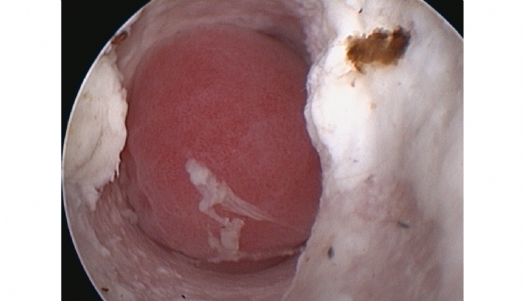 Aspect typique d'un polype dans le conduit horizontal chez un chat.