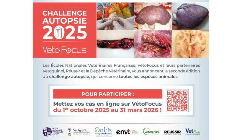 Les écoles nationales vétérinaires françaises et le site de cas cliniques en ligne VétoFocus avec leurs partenaires Vetoquinol, Réussir et La Dépêche Vétérinaire annoncent la seconde édition du Challenge autopsie qui concerne toutes les espèces animales. Ce challenge est ouvert à tous, vétérinaires praticiens et étudiants (publication avec un encadrant vétérinaire de leur choix, enseignant ou tuteur de stage). Pour participer, les candidats sont invités à mettre leurs cas cliniques en ligne sur VétoFocus (www.vetofocus.com) avant le 31 mars.