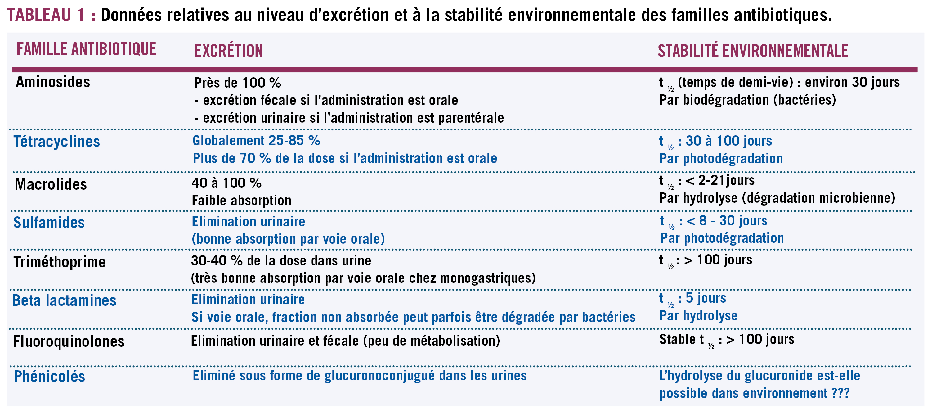 L'élimination des antibiotiques se fait fréquemment sous forme active dans les urines et/ou les fèces et/ou le lait des animaux traités.