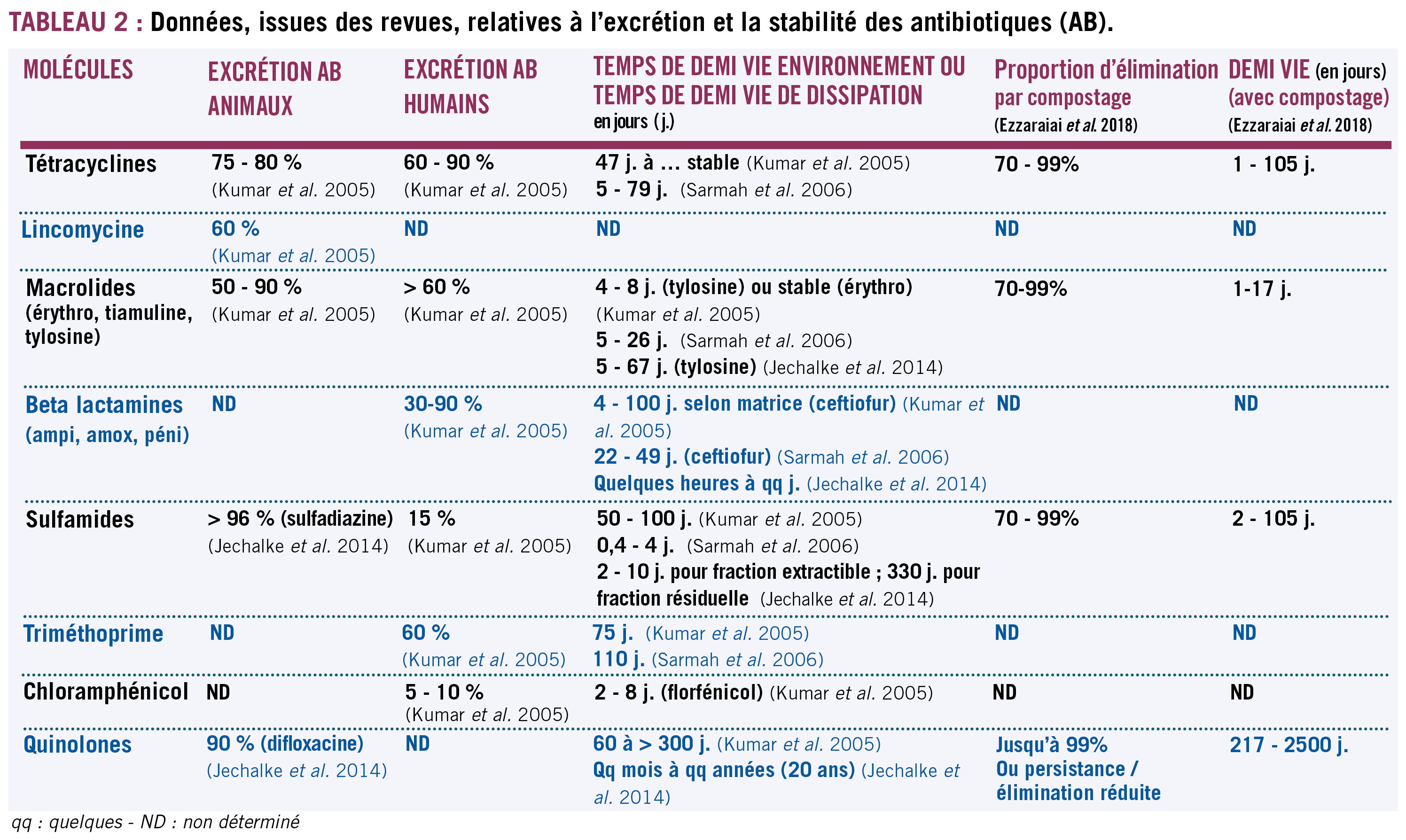 Selon la famille d'antibiotiques et les modalités d'administration (orale versus parentérale), ces proportions excrétées oscillent entre 5 et 90 % de la dose administrée mais sont fréquemment de l'ordre de 60 à 80 % (cf. tableaux 1 à 3 ; Berendsen et al. 2015, Jechalke et al. 2014, Kumar et al. 2005). La question de l'usage en aquaculture n'est pas abordée dans ces publications et mériterait un traitement particulier en raison de sa connexion directe avec l'environnement aquatique. Notons au passage que les médicaments vétérinaires sont également excrétés par les animaux de compagnie et peuvent ainsi aussi se retrouver au même titre que les médicaments humains dans des stations d'épuration périurbaines (Perkins et al. 2021).