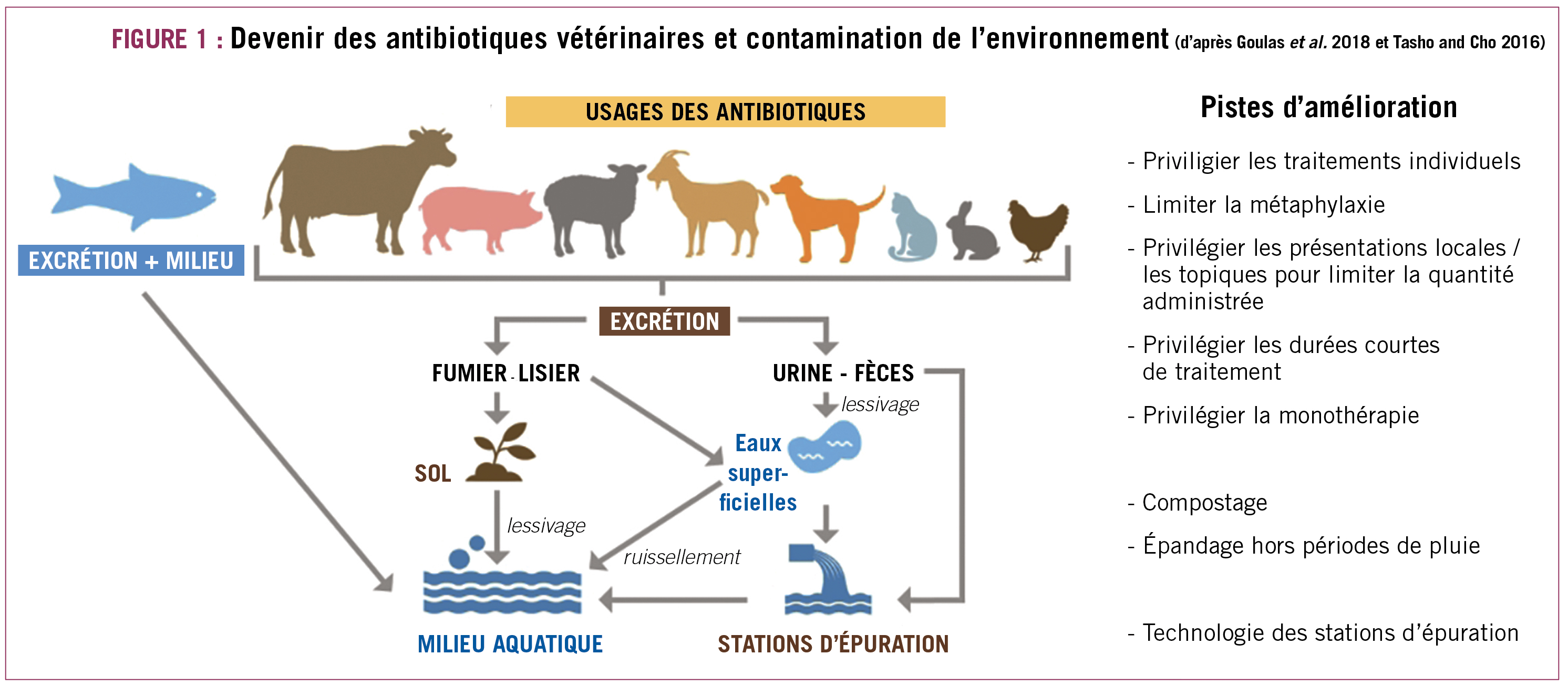 Dans ce contexte, il convient de promouvoir les bonnes pratiques telles que celles que l'on retrouve dans l'arrêté du 22 juillet 2015 (relatif aux bonnes pratiques d'emploi des médicaments contenant une ou plusieurs substances antibiotiques en médecine vétérinaire) ou celles énoncées à droite de la figure 1 : limiter le recours aux antibiotiques en termes de nombre d'animaux traités, de quantités, de durées de traitements, s'intéresser à la gestion des effluents, ...