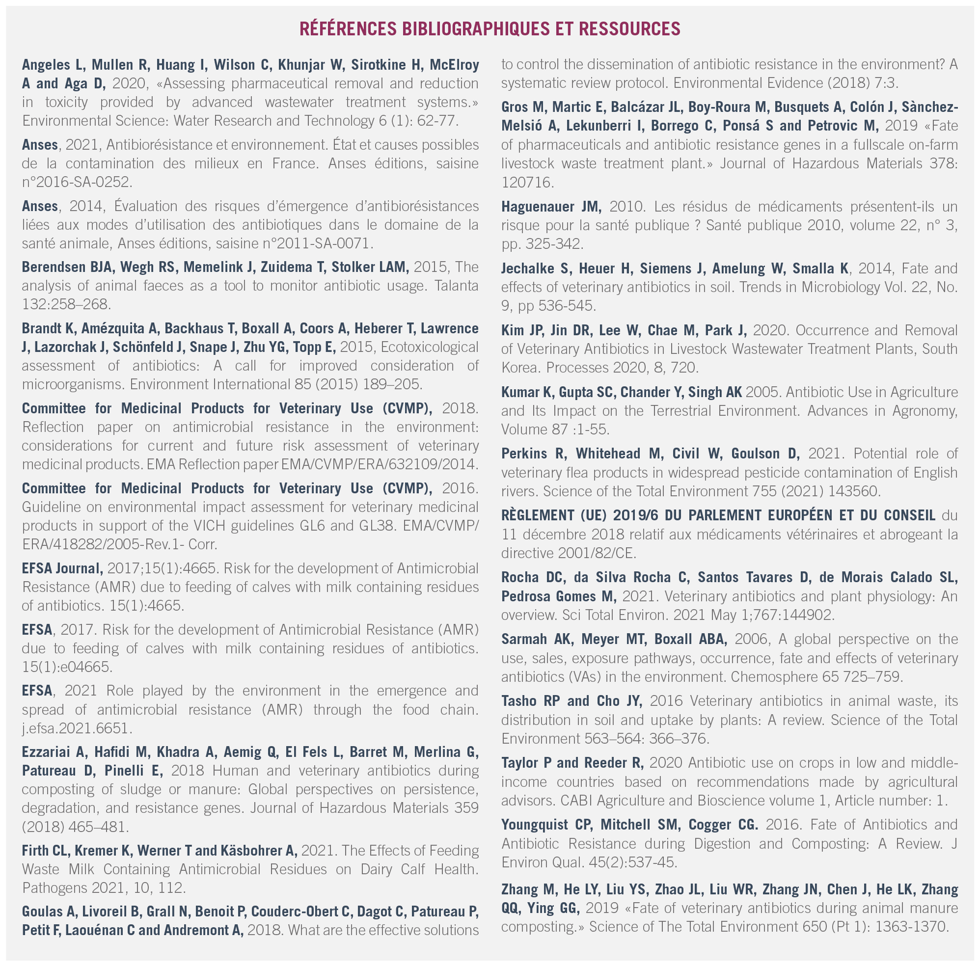 La contribution de l'environnement à l'émergence, la sélection et/ou la dissémination de résistances aux antibiotiques à l'homme et à l'animal devrait être à l'avenir prise en compte dans l'évaluation de la sécurité des médicaments vétérinaires (CVMP, 2018 ; Règlement 2019/6).
