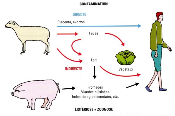 Si l'on connaît des cas de listériose cutanée par contamination directe chez les éleveurs ou les vétérinaires lors d'avortement chez les ruminants, dans 99 % des cas, l'Homme se contamine par la consommation de produits d'origine animale ou végétale très variés (voir figure n° 2), qu'ils soient consommés crus (produits laitiers, végétaux, viandes, poissons, coquillages...) ou cuits.
