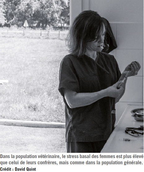 Concernant la source de ce stress, un sondage OpinionWay 3 sur « les français et le stress » réalisé sur 1000 personnes en octobre 2017 donne des chiffres susceptibles de nous éclairer. Si on retrouve un stress plus important chez les femmes avec 60 % qui se disent stressées contre 38 % des hommes, l'information la plus intéressante dans ce sondage réside dans la hiérarchie des causes de ce stress. Pour les hommes, la principale cause de stress est la vie professionnelle, suivie des problèmes financiers puis des problèmes de santé, tandis que pour les femmes, la première source de stress est la vie personnelle, suivie des problèmes financiers et enfin de la vie professionnelle. Le recoupement de toutes ces données permet de penser que les femmes vétérinaires sont effectivement plus stressées que leurs confrères mais probablement par leur vie personnelle et non professionnelle.