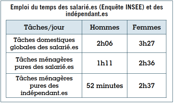 Chez les indépendant.es, c'est pire. Si les femmes gardent le même temps de taches ménagères (2h37), les hommes eux n'y consacrent plus que 52 minutes. Il serait tentant de penser que les choses se sont surement améliorées depuis 2010, cependant cela semble peu probable d'après un rapport de l'INSEE de 2012. En effet, celui-ci stipule : « En 2010, les hommes effectuent 2h13 de tâches domestiques en moyenne par jour (contre 4h01 pour les femmes), soit une durée équivalente à celle effectuée en 1999 (2h13) et 1986 (2h07). Pourtant en 25 ans, leur durée moyenne de travail professionnel s'est écourtée de 32 minutes ».
