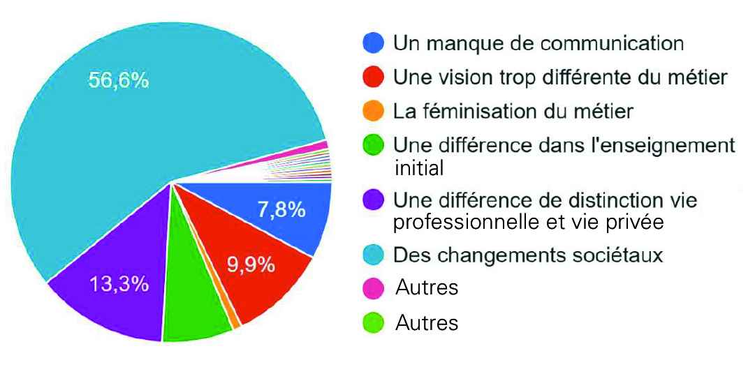 Viennent ensuite des différences d'arbitrage entre vie privée et vie professionnelle (44 sur 332, soit 13,3 %), une vision différente du métier (33, soit 9,9 %), un manque de communication (26, soit 7,8 %) ou encore une évolution de l'enseignement (24, soit 7,2 %).