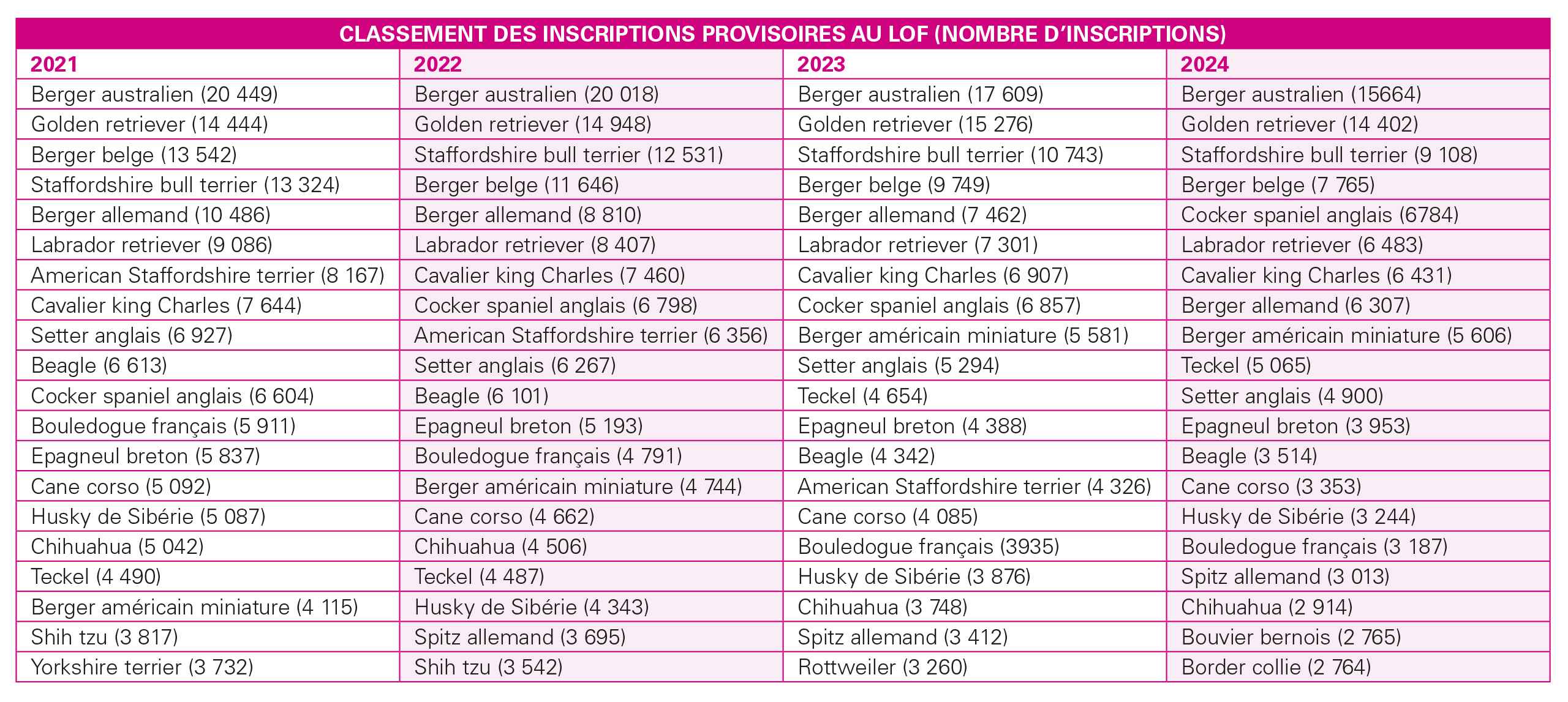 Elle précise que deux races ont quitté le top 20 : le Staffordshire terrier américain (- 6 places) et le rottweiler (- 2 places).