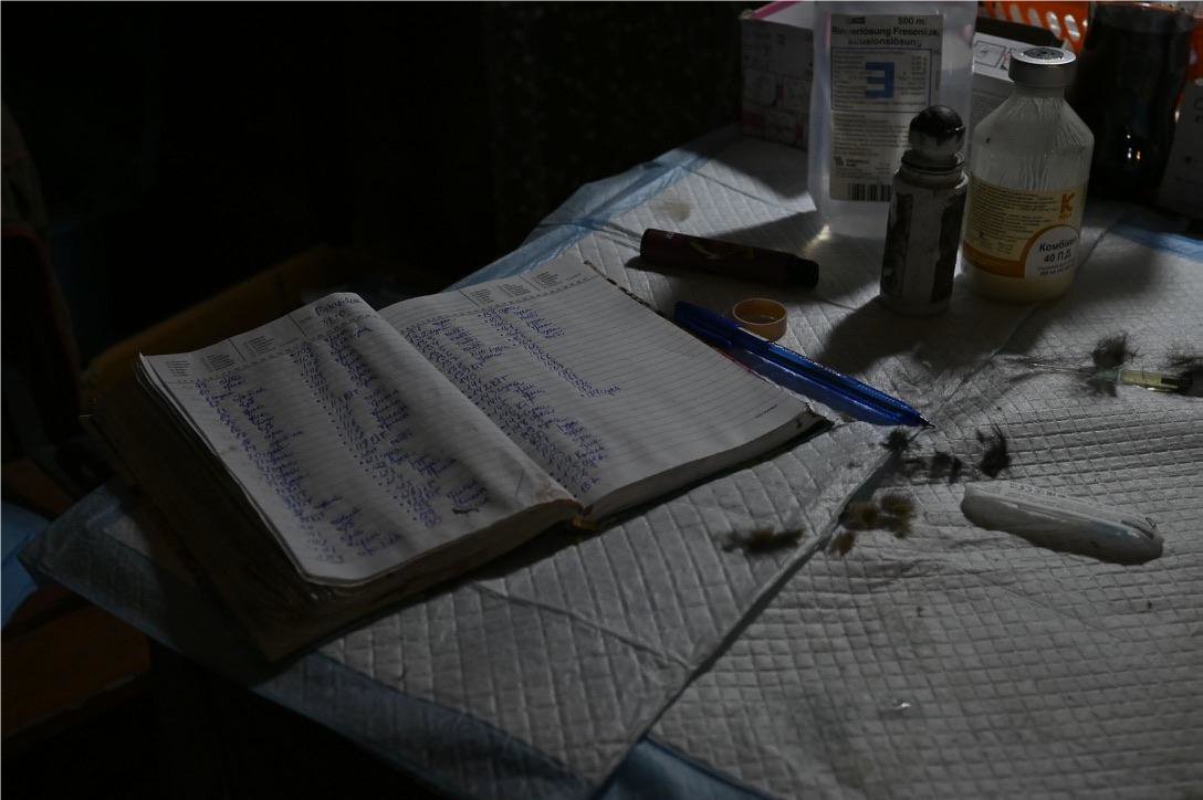 Dans la clinique, les animaux sédatés sont alignés par dizaine sur le sol, un radiateur électrique est pointé dans leur direction. Les chiens de bénévoles se promènent en liberté entre les cages. Le jeune staff noir Tripode peine à monter sur le canapé, il a perdu sa patte avant. La pièce est un lieu de vie bruyant et odorant. Les bénévoles y mangent, vont et viennent avec les cages alors que les vétérinaires opèrent à la chaîne dans un coin de la pièce. « C'est pour ça qu'on traverse l'Ukraine. Notre action était nécessaire avant l'invasion à grande échelle, elle l'est encore plus maintenant », souligne Yulia.