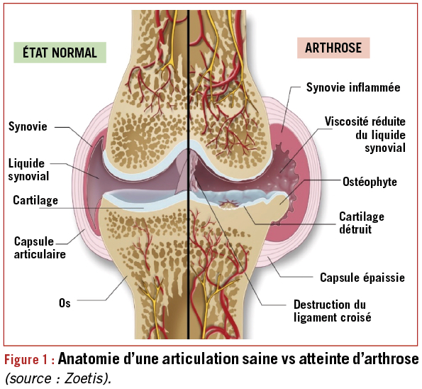 La dégénérescence du cartilage est le phénomène initial dans l'arthrose. Cette altération réduit son rôle d'absorption des chocs et de transmission des pressions. Ainsi l'os sous-chondral subit une hyperpression qui active les nocicepteurs présents dans l'articulation et qui sont sensibles aux stimuli mécaniques 19.