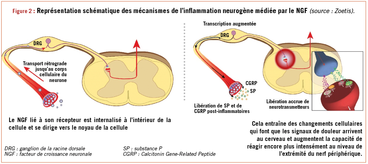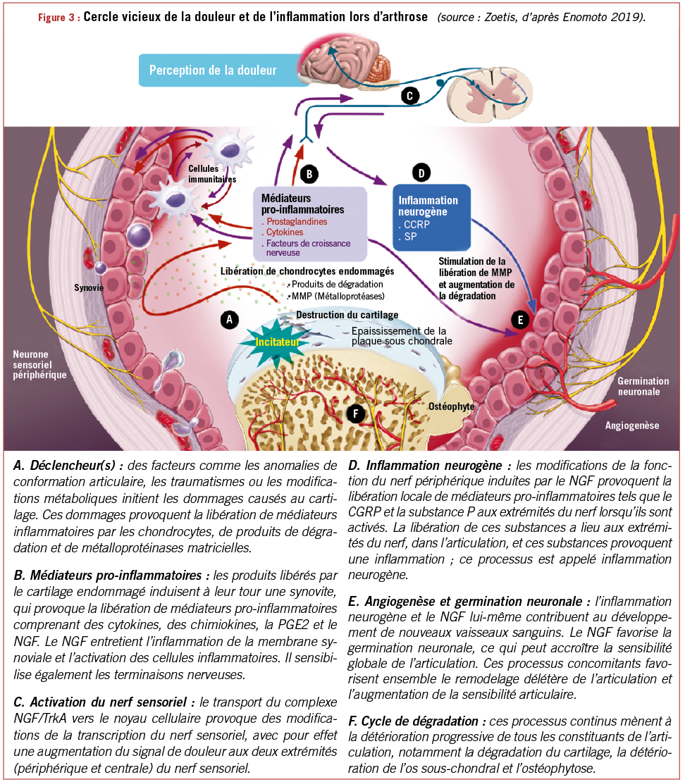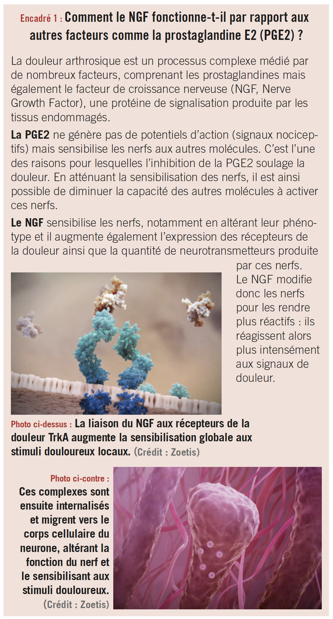 Le NGF (Nerve Growth Factor - facteur de croissance neuronale) 4,21,22 est un des médiateurs libérés dans l'articulation ; ses taux synoviaux sont augmentés chez les patients arthrosiques 23 et des arguments thérapeutiques valident son rôle physiopathologique.