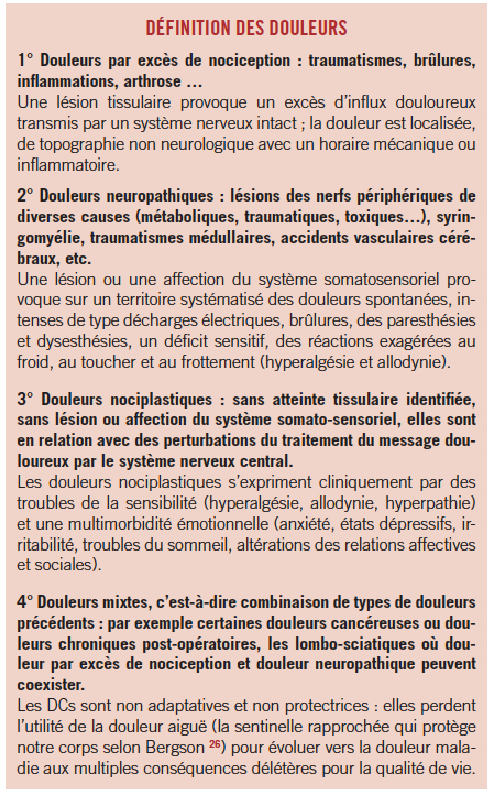 La physiopathologie de la douleur chronique 11,12 est liée pour les douleurs nociceptives et neuropathiques (prévalence d'environ 6 à 7 % de la population humaine adulte 13) à l'existence de lésions tissulaires suffisamment maintenues dans le temps pour induire des changements fonctionnels et histologiques du système nerveux.