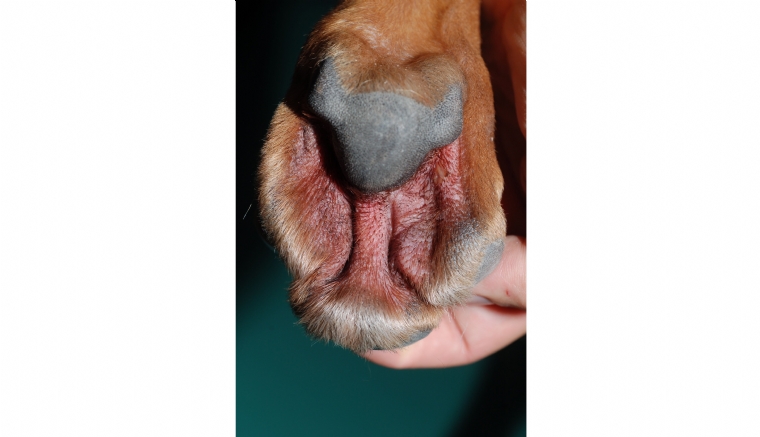 Photo n° 1 : Pododermatite à Malassezia chez un boxer atopique : une indication commune du recours aux antifongiques en week-end thérapie.