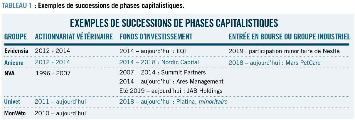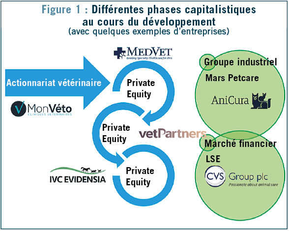 Au cours de son développement, un groupe connaît plusieurs phases capitalistiques (cf. fig. 1) : la première est toujours un actionnariat 100 % vétérinaire, ensuite un fonds d'investissement peut entrer au capital et plusieurs fonds peuvent se succéder pendant plusieurs années. Enfin, le groupe peut s'introduire en bourse ou rejoindre un puissant groupe industriel.