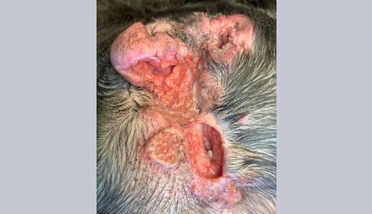 Mercredi 6 Septembre 2023 Animaux de compagniePhoto n° 1 : Lésions inguinales ulcérées et bourgeonnantes s'étendant jusqu'à la vulve.