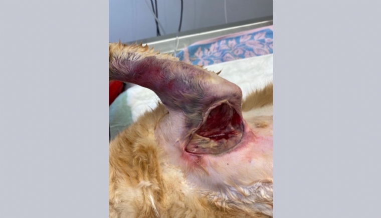 En effet, la cicatrisation se fait par rétraction circulaire de l'extérieur vers l'intérieur. Or, lorsque l'absence de peau est située tout autour du membre, il y a un phénomène de rétraction circulaire autour du membre qui tire la peau du carpe vers l'extrémité de la patte et la peau du coude vers l'épaule. Aucun millimètre n'a poussé vers la zone manquante en 6 mois.