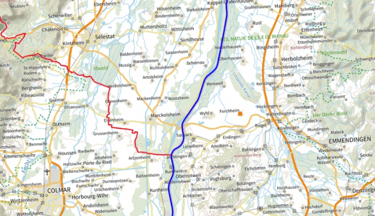 Le foyer (point orange) est situé à 6-7 km de la frontière avec la France dans la commune de Forchheim dans le land du Bade-Wurtemberg.