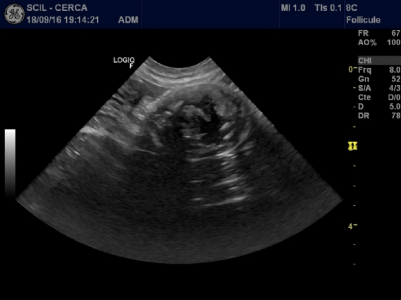 - échographie abdominale (photos n° 1) : observation d'une masse sphérique hétérogène de 2 cm de diamètre avec des parties calcifiées ; aucun lien avec les organes autour n'a été identifié, la masse semble encapsulée ; certaines zones semblant calcifiées, il a été décidé de réaliser une radiographie abdominale ;