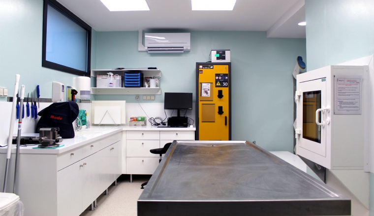 « D'une dimension de 24 m², la salle remplit les conditions requises par l'annexe IV de l'arrêté du 16 juillet 2007 concernant les mesures de confinement à mettre en oeuvre dans les salles d'autopsies où les travailleurs sont exposés à des agents pathogènes du groupe 3. Elle abrite un équipement complet de manière à éviter l'entrée et la sortie de matériel (appareil photo, microscope...). La salle est équipée d'un sas à double entrée avec des portes asservies pour l'entrée des personnels et d'un sas à double entrée avec chambre froide pour l'entrée des carcasses, permettant le stockage des corps arrivant en dehors des périodes de fonctionnement » , détaille VetAgro Sup.