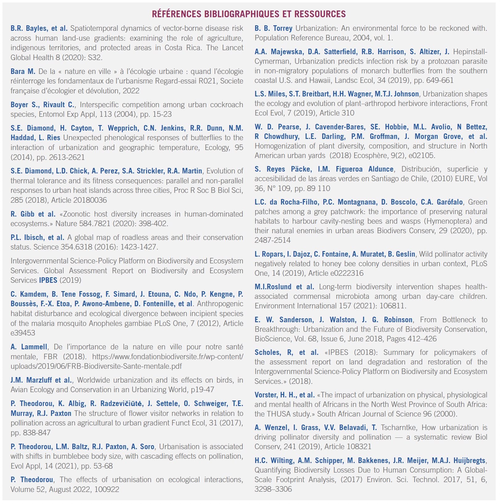 Dans une opinion publiée en août 2022, Panagiotis Theodorou (Theodorou, 2022), un chercheur allemand, présente une synthèse des études d'écologie urbaine sur les insectes et montre des effets contrastés.